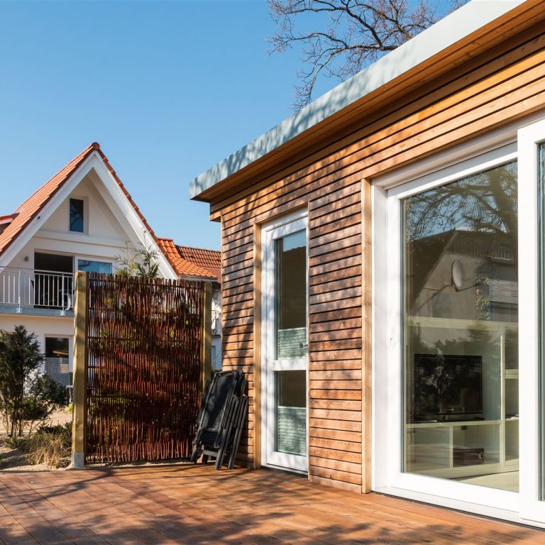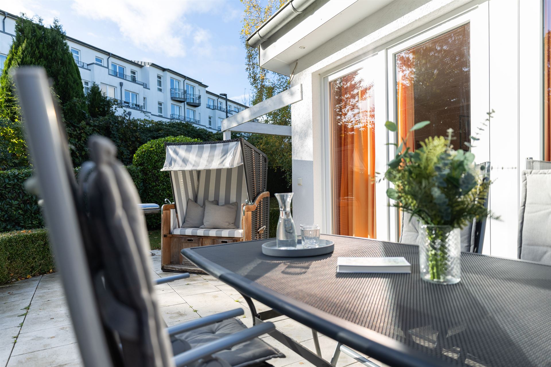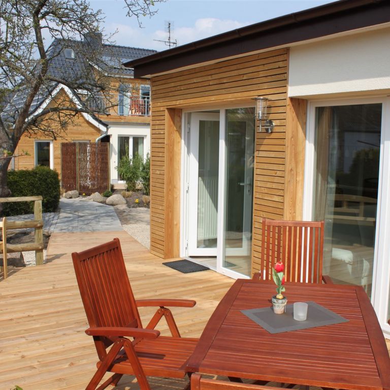 Atmosphäre in der Idylle einer ruhig gelegenen Nebenstraße. Großer Garten mit Terrasse und Grillplatz. Zentrumsnähe und dennoch nur 10 Gehminuten zum Ostsee-Strand und Wellenbad.