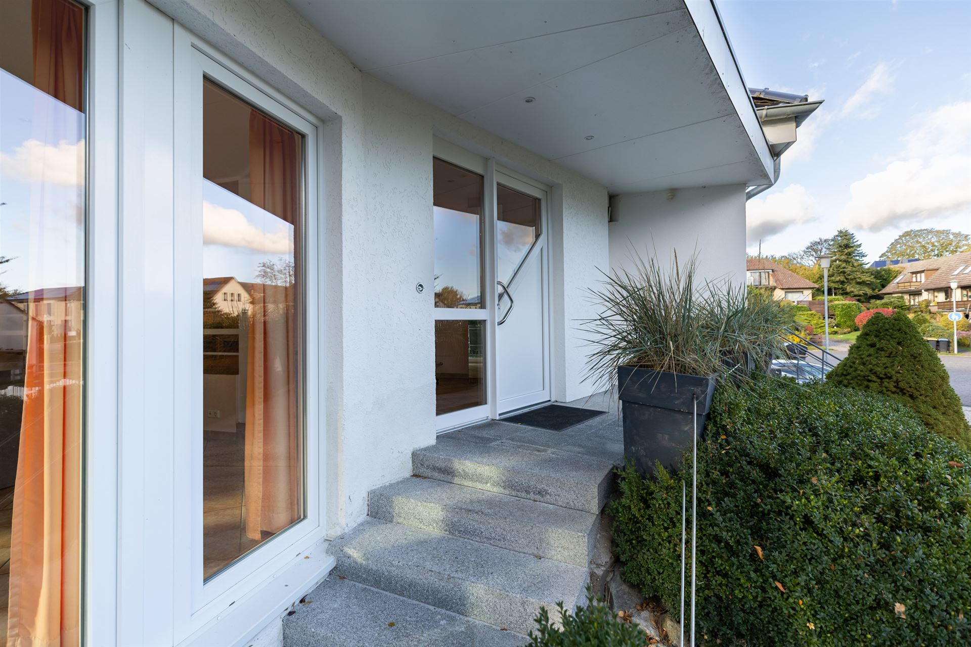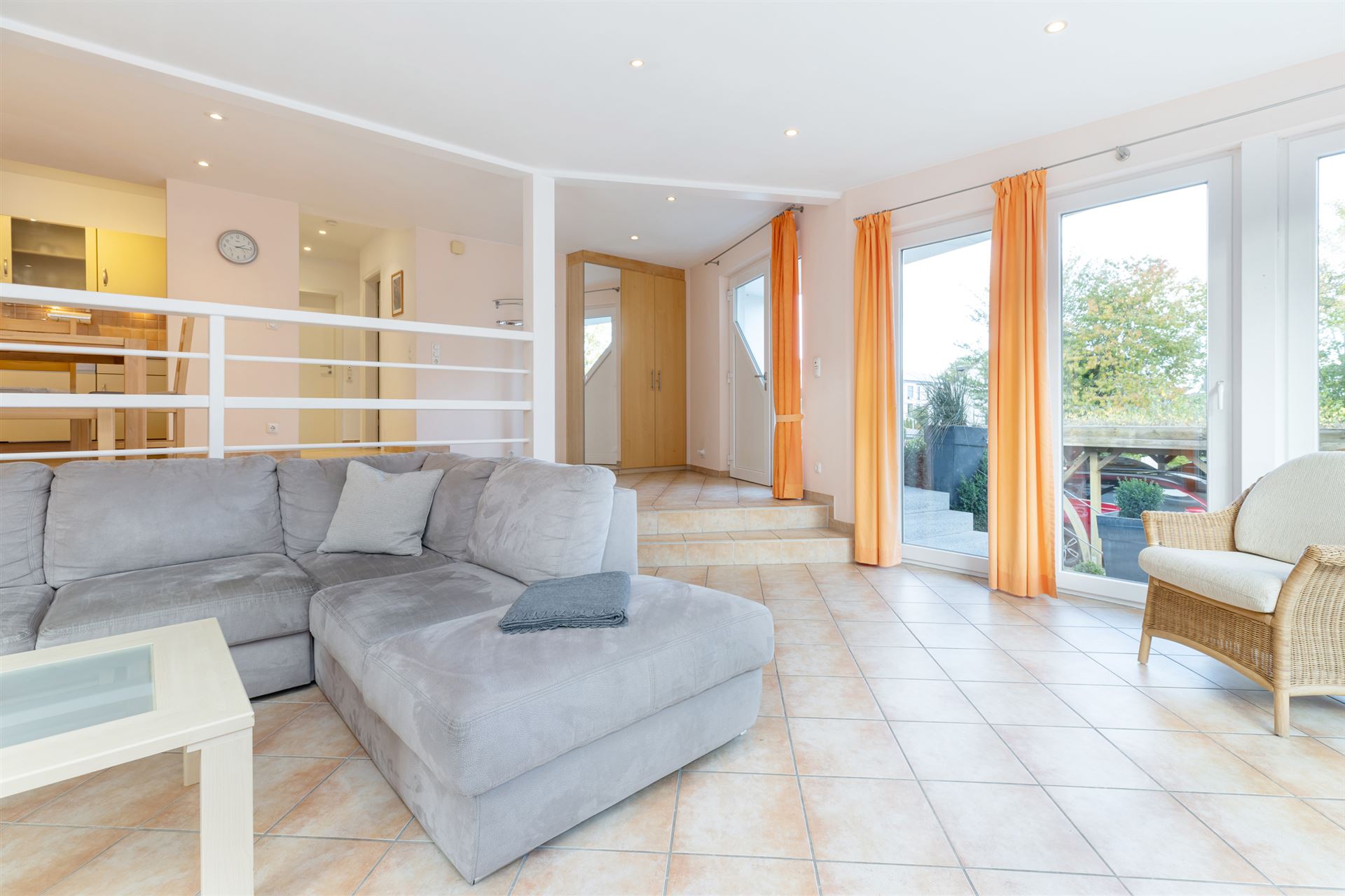 Im unteren Wohnbereich befindet sich die große Sitzgruppe mit Sofa, Tisch und Sessel, umgeben von Fenster-Schiebeelementen, die der ganzen Wohnung Tageslicht bieten.