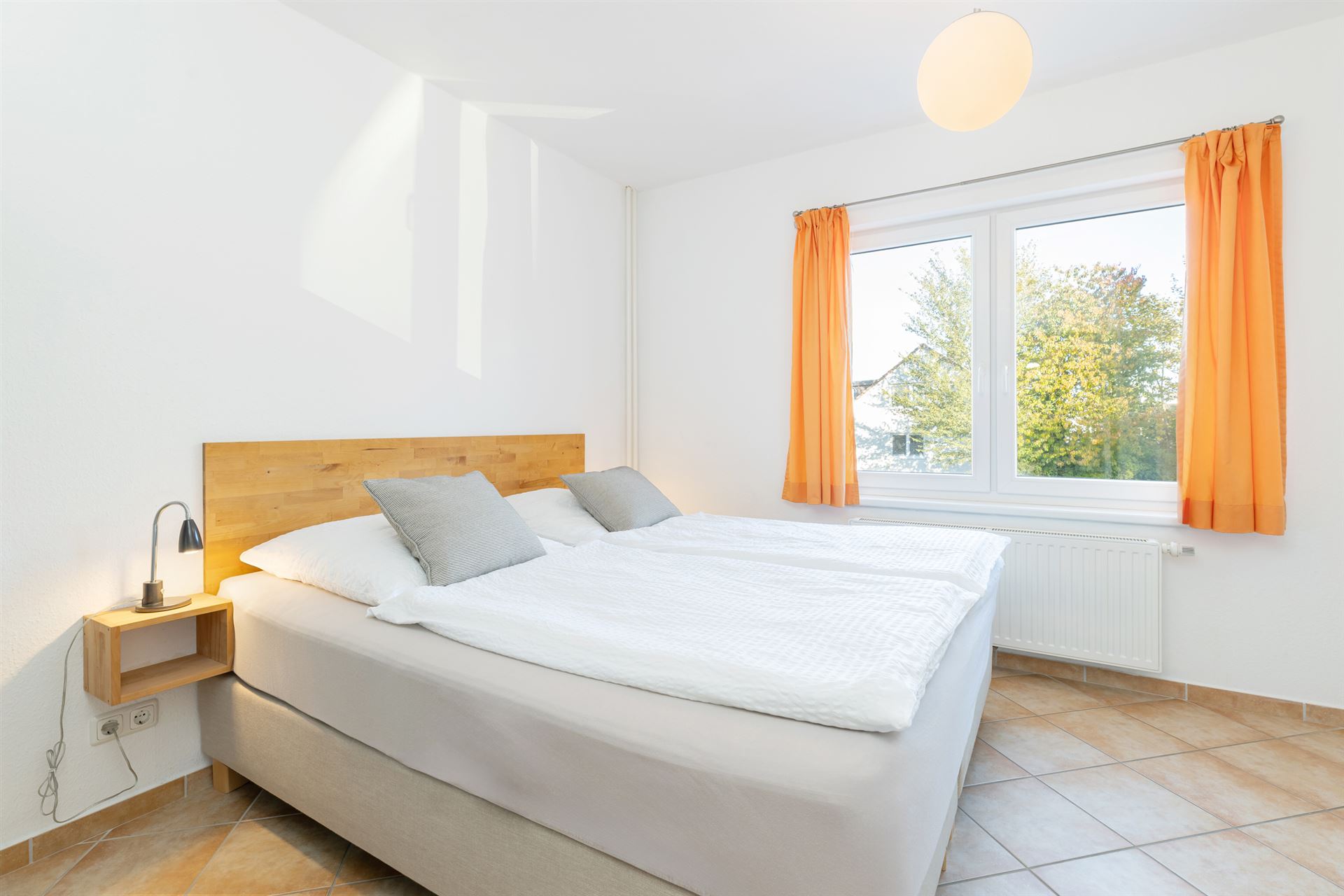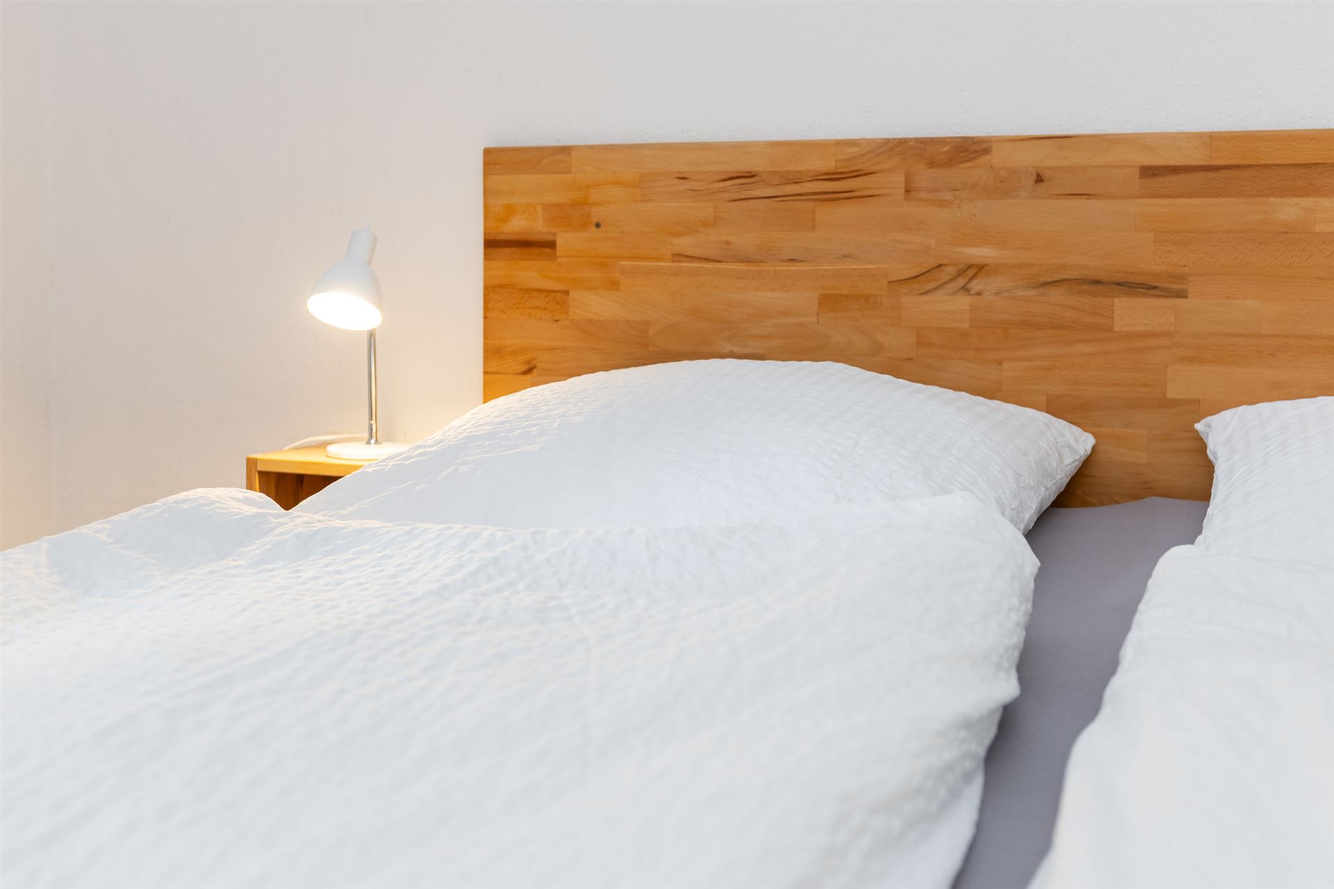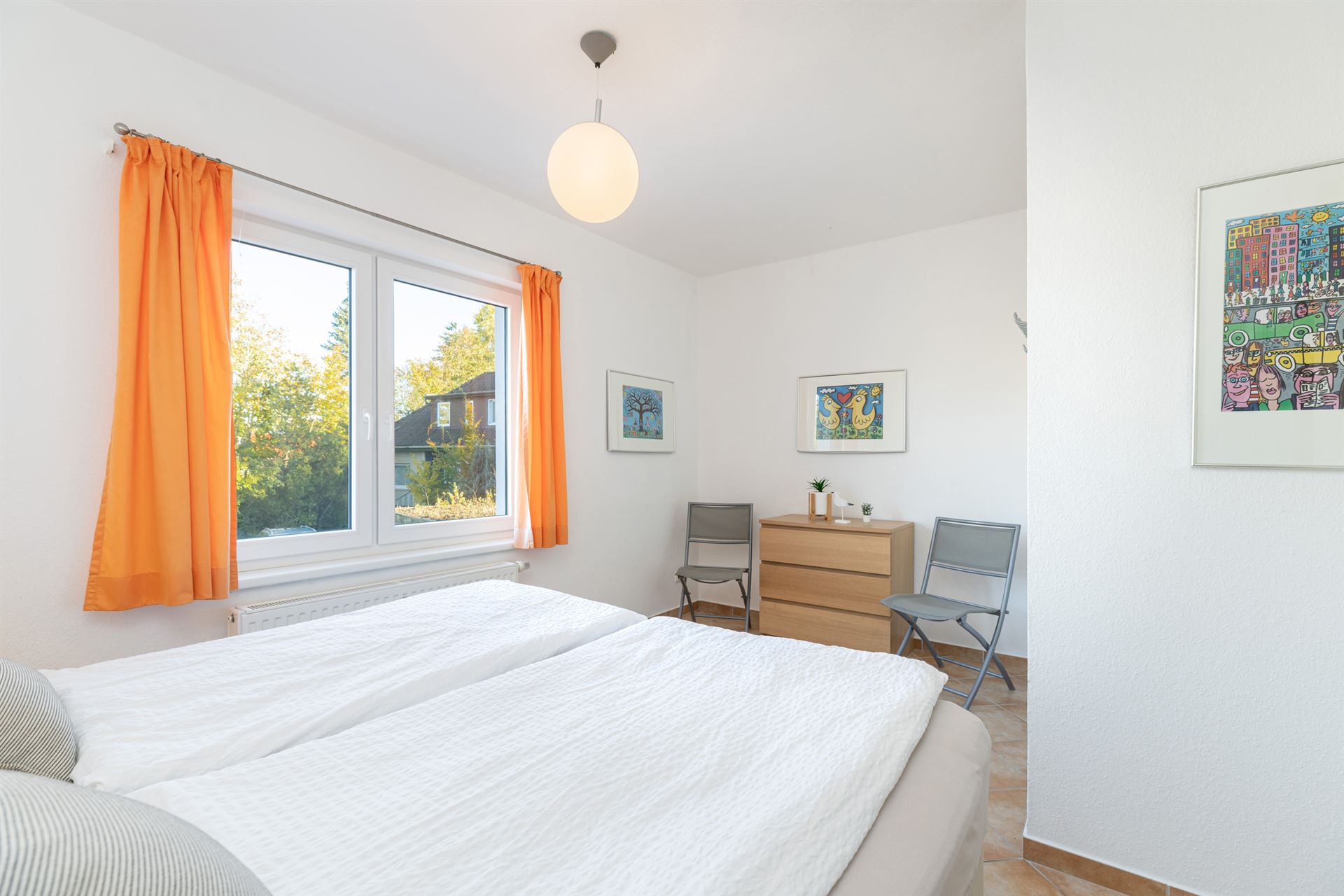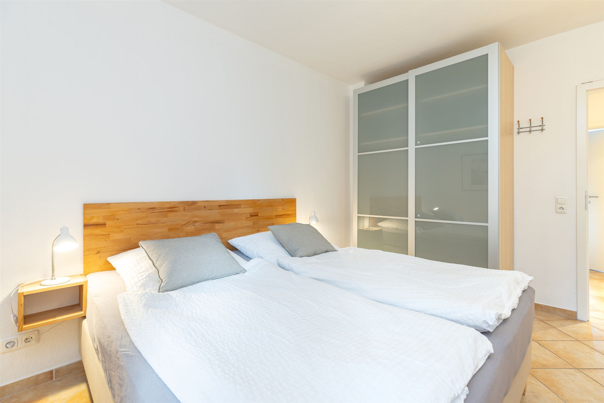 Durch einen schmalen Flur kommen Sie zu den Schlafräumen, Duschbad und Gäste-WC. Das erste Schlafzimmer besteht aus einem Doppelbett (Boxspring, je 90 x 200 cm), Kleiderschrank und Kommode. Das zweite Schlafzimmer hat 2 Betten (Boxspring, je 90 x 200 cm) und einen Kleiderschrank.