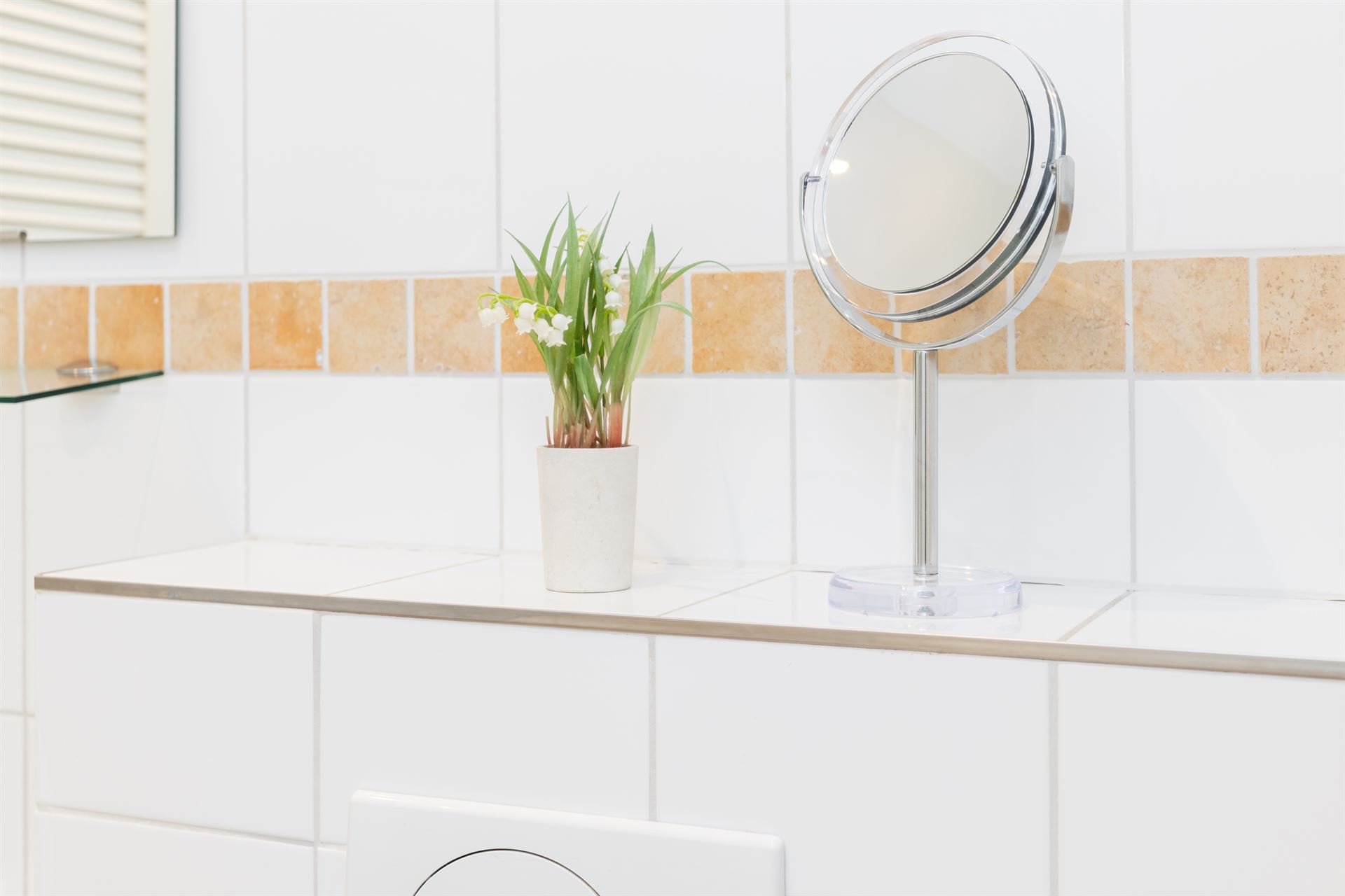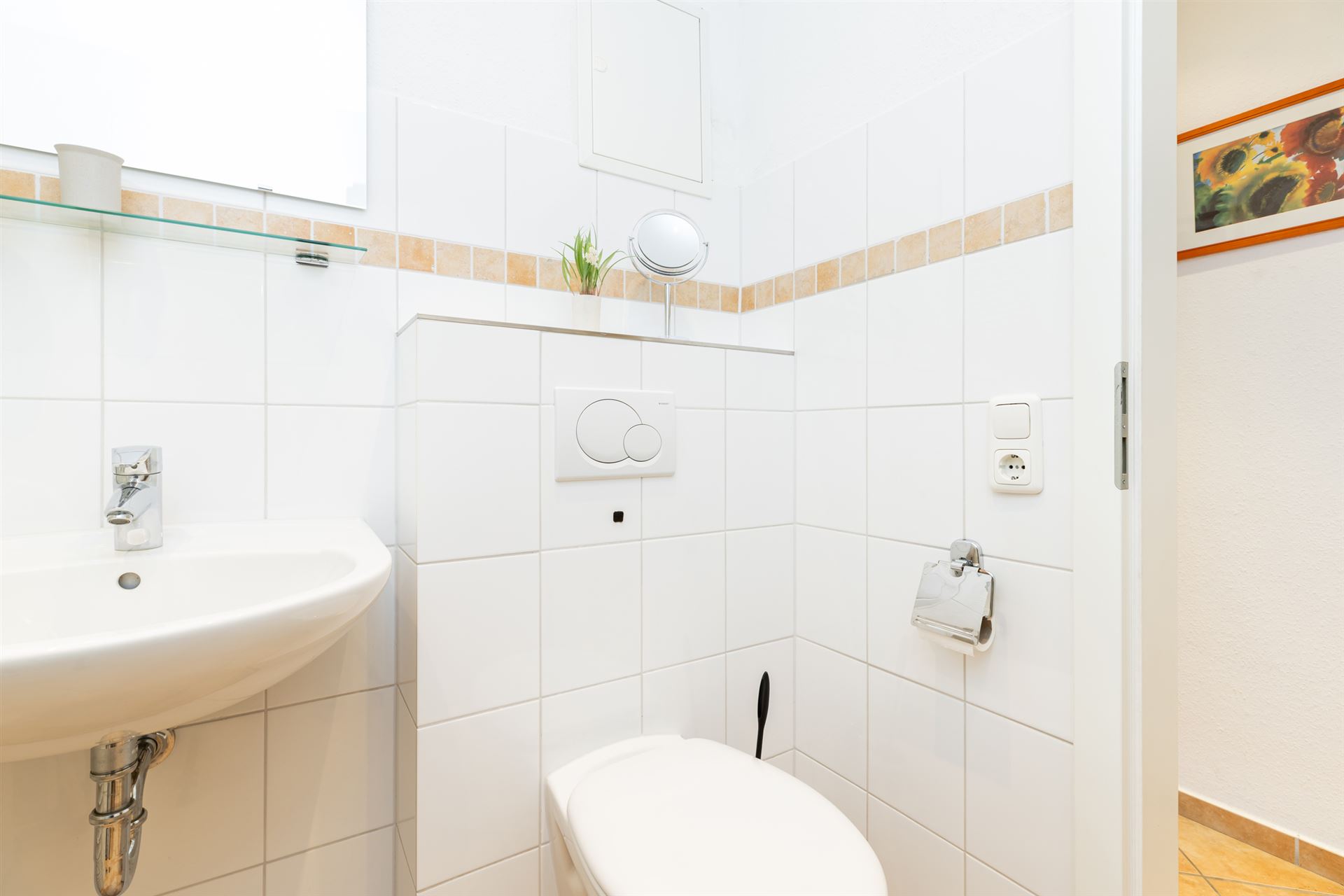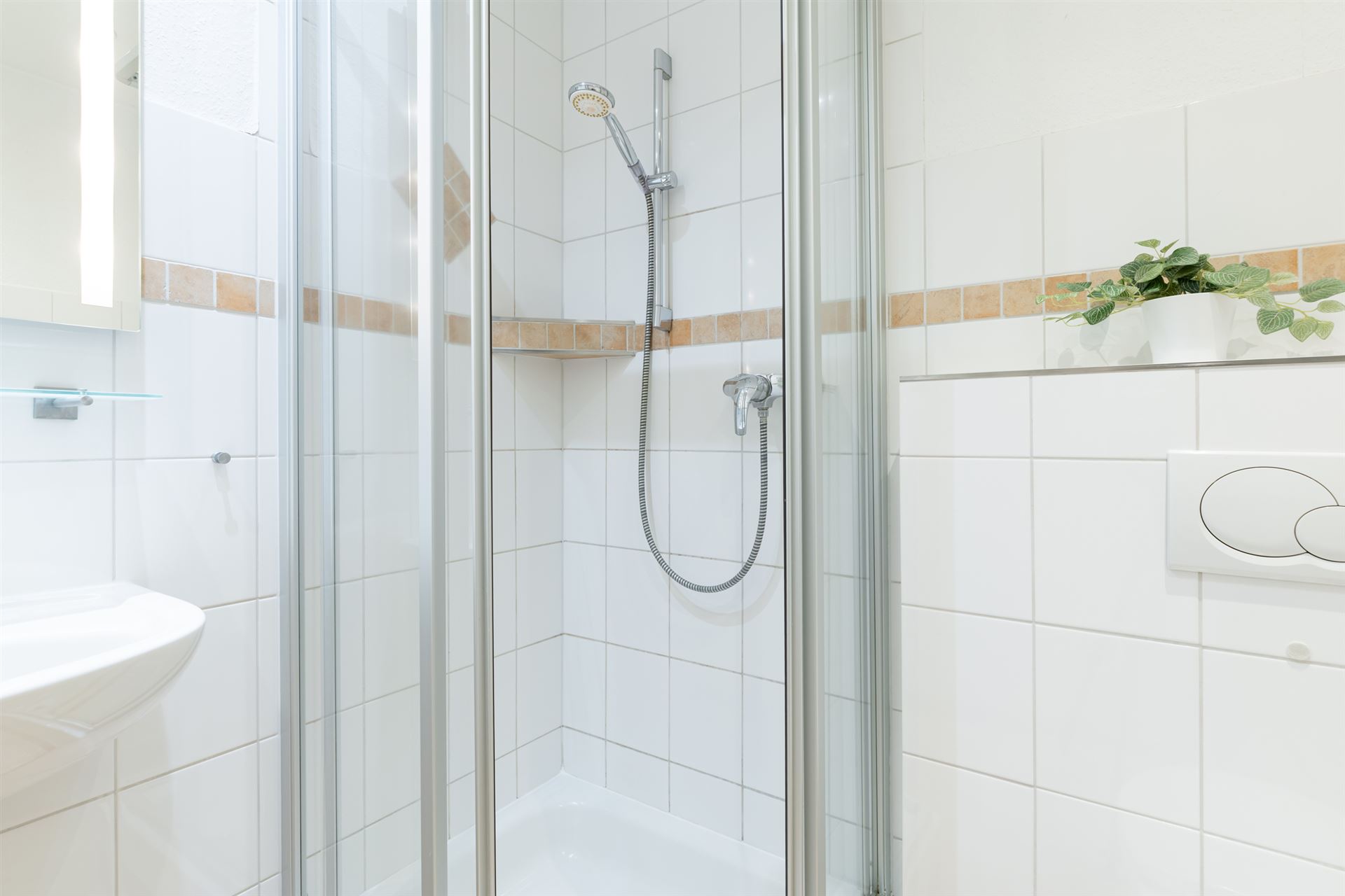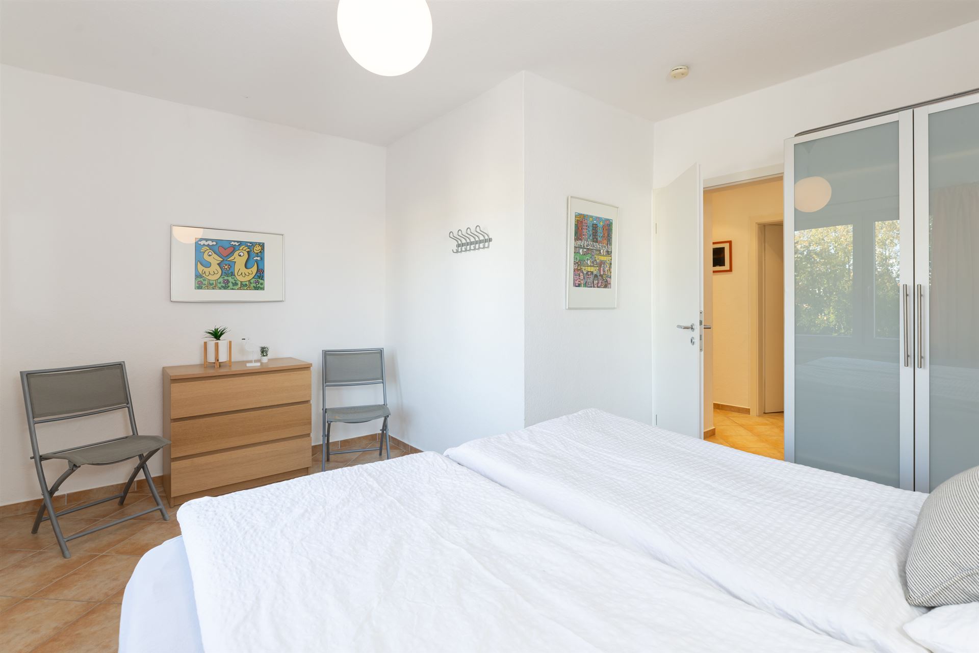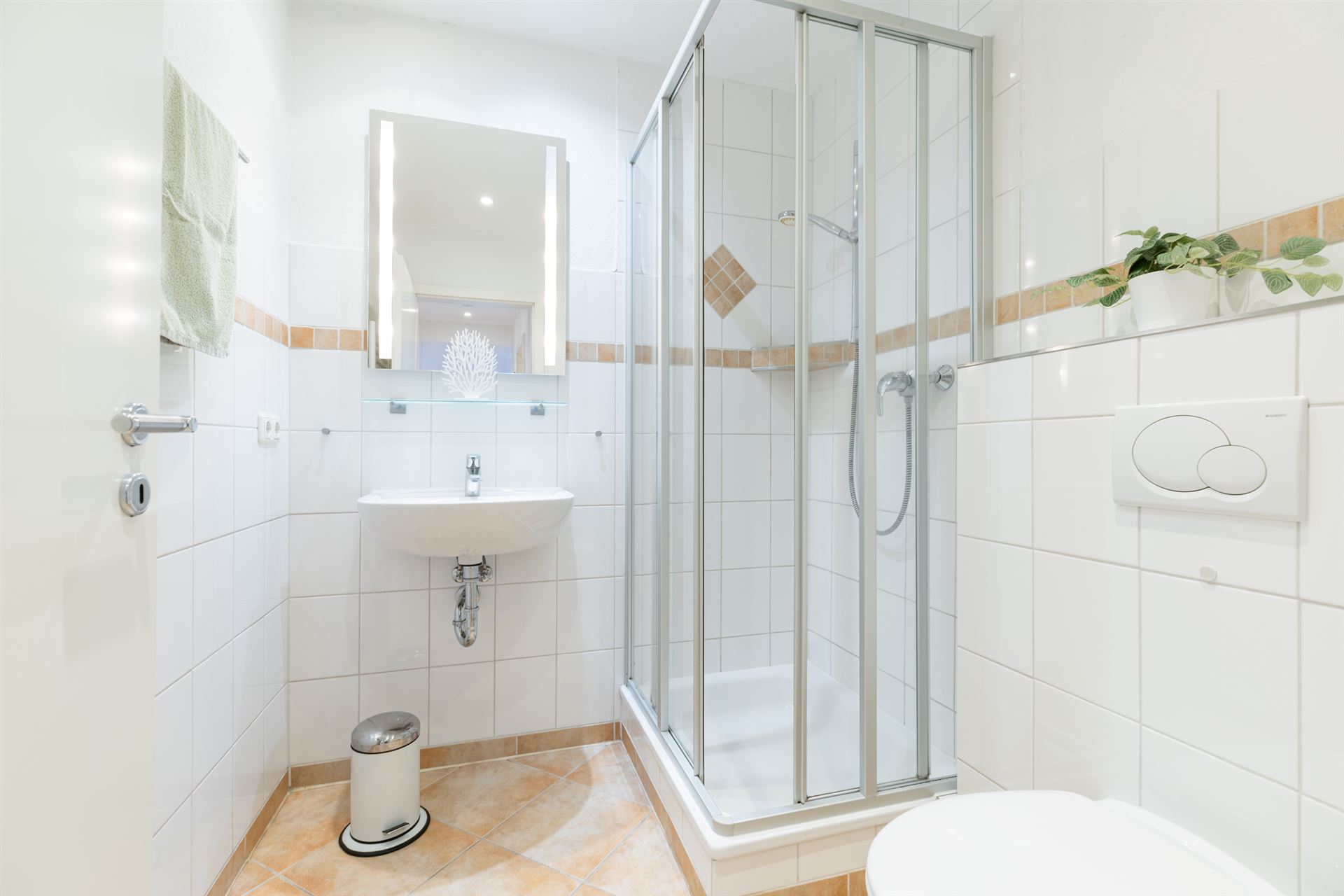 Durch einen schmalen Flur kommen Sie zu den Schlafräumen, Duschbad und Gäste-WC. Das erste Schlafzimmer besteht aus einem Doppelbett (Boxspring, je 90 x 200 cm), Kleiderschrank und Kommode. Das zweite Schlafzimmer hat 2 Betten (Boxspring, je 90 x 200 cm) und einen Kleiderschrank.