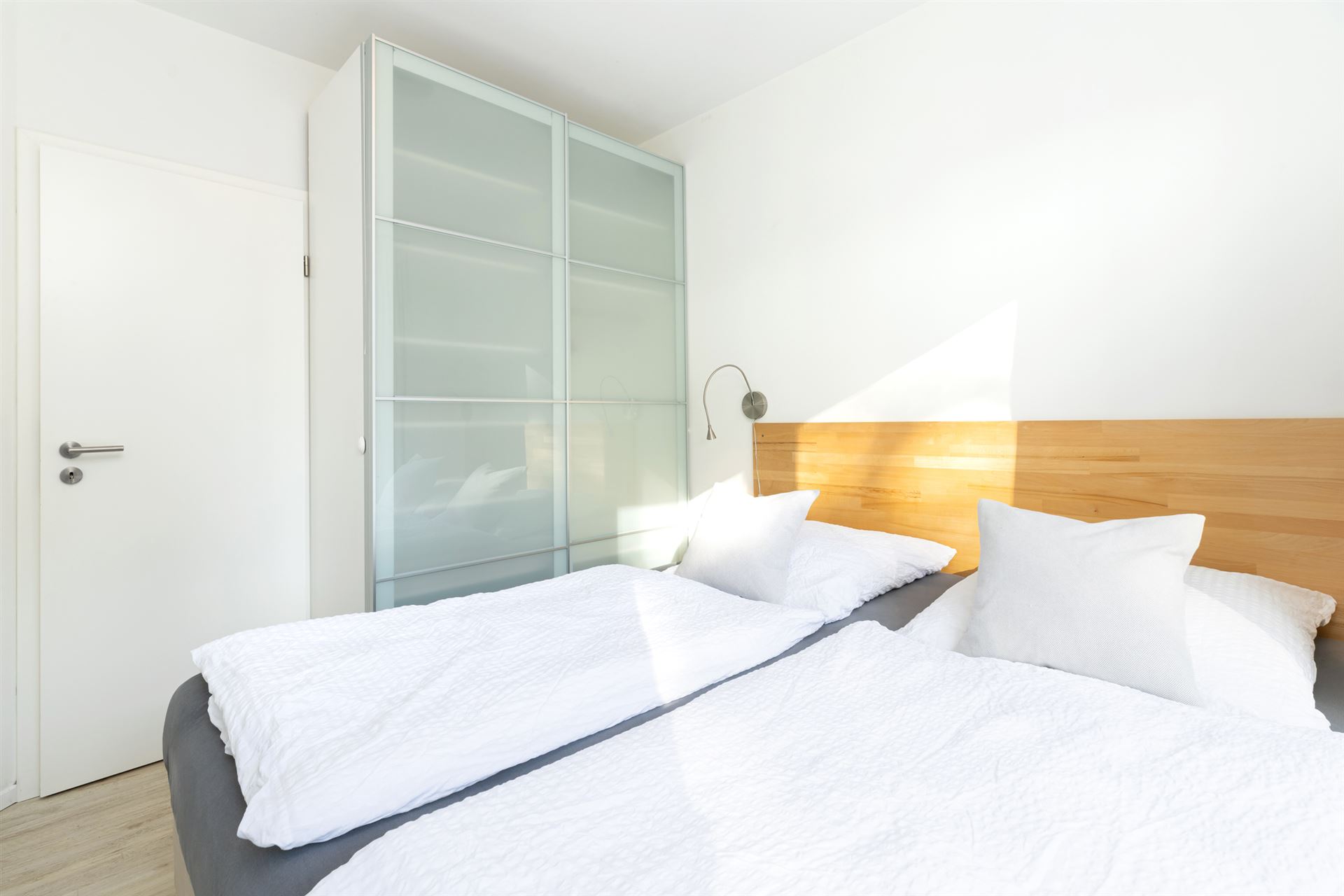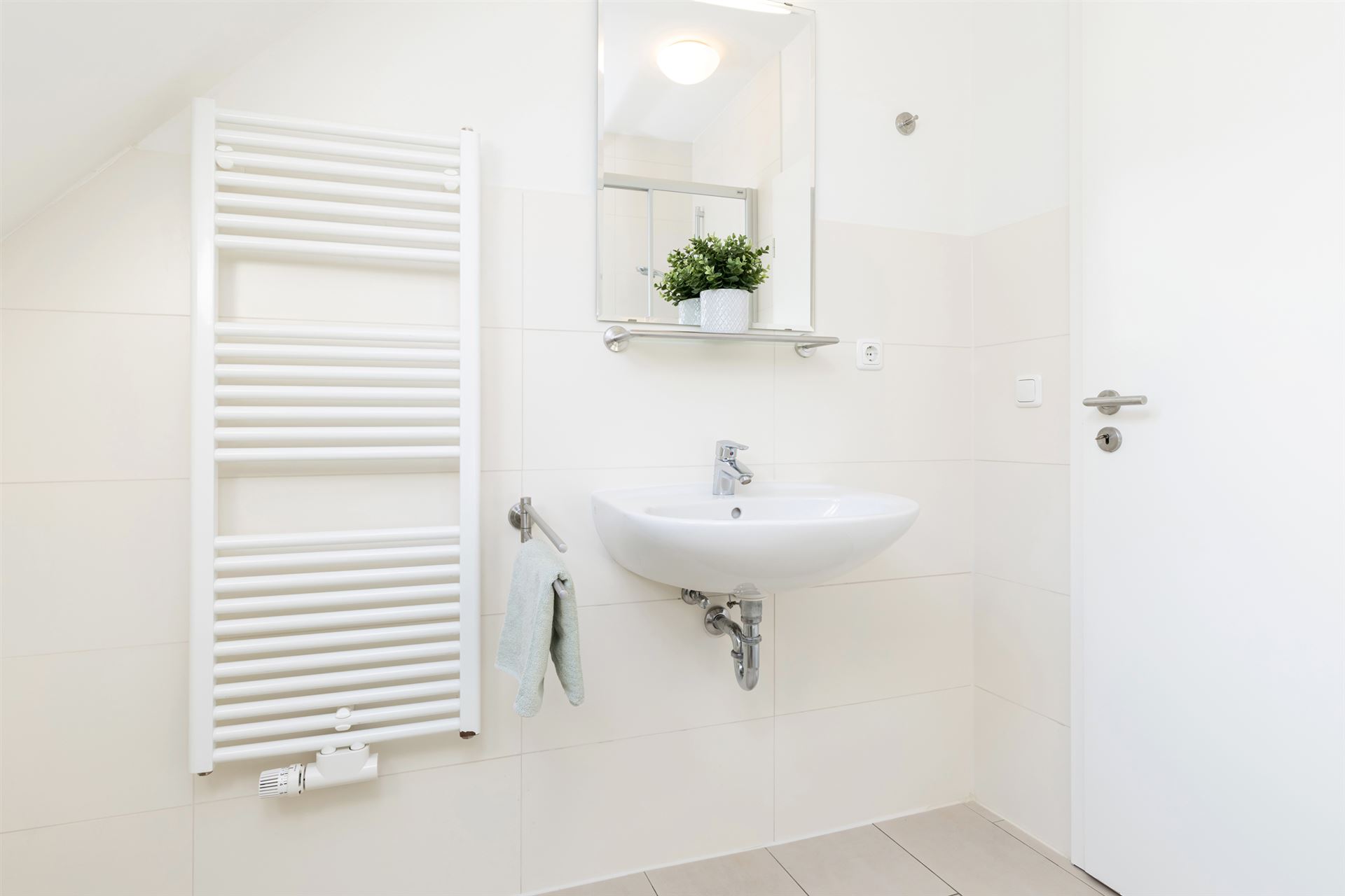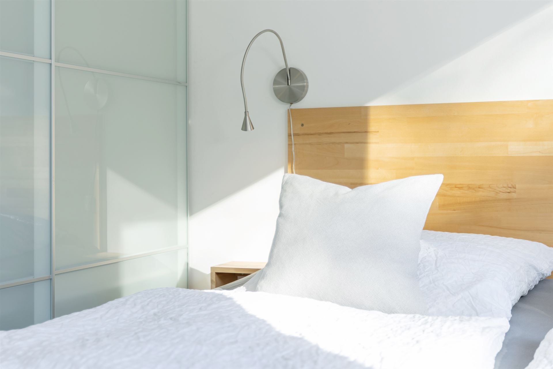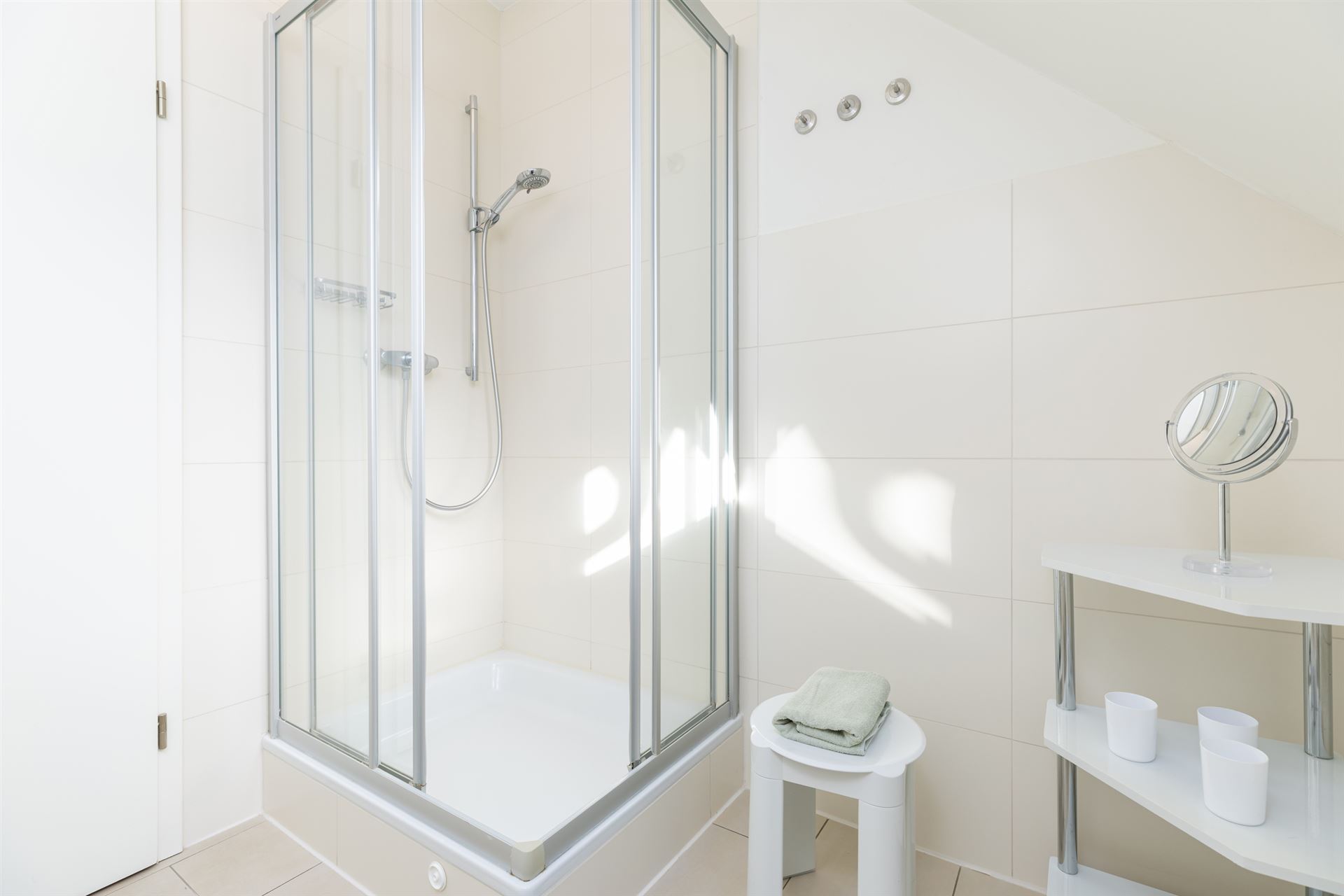 Das Schlafzimmer hat ein Doppelbett mit je 90 x 200 cm (Boxspring) + Kleider-Schiebeschrank. Das Bad ist hell gefliest und lässt viel Morgensonne durch das Dachfenster. Echtglasdusche und weiße Objekte mit Handtuch-Heizkörper sowie schöne Accessoires wirken einladend.